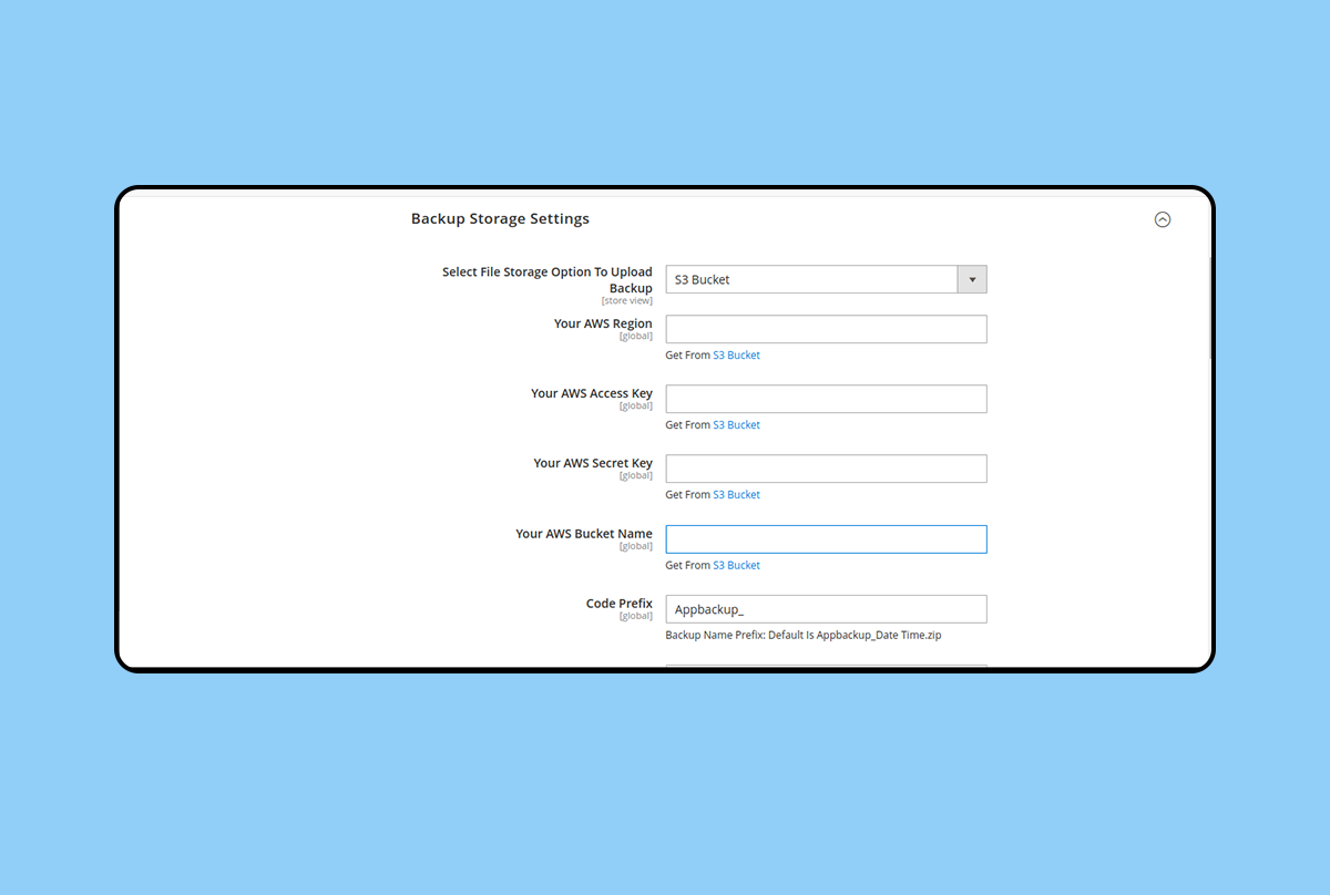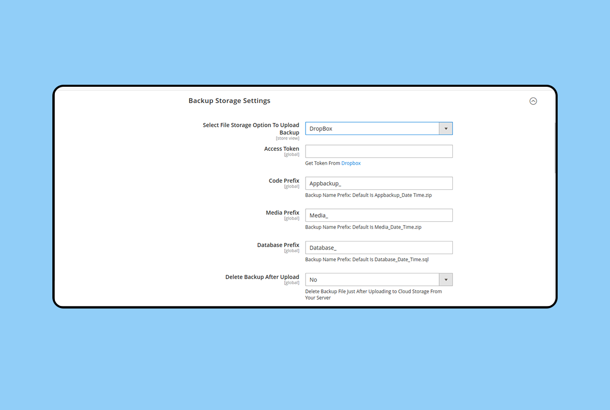 - The admin has 3 options to backup Magento 2 store: Google Drive , Dropbox And S3 Bucket