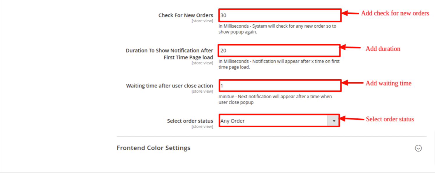 Admin can decide where to place notification in screen. Admin can decide the order status for which the notification should appear. Notification popup can be formatted by colors. Admin can set the popup notification timing like after how many seconds the notification should come when user loads a website for the first time, after how many seconds notification should reappear provided there are new orders and after how many minutes notification should reappear when user closes the popup provided there are new orders