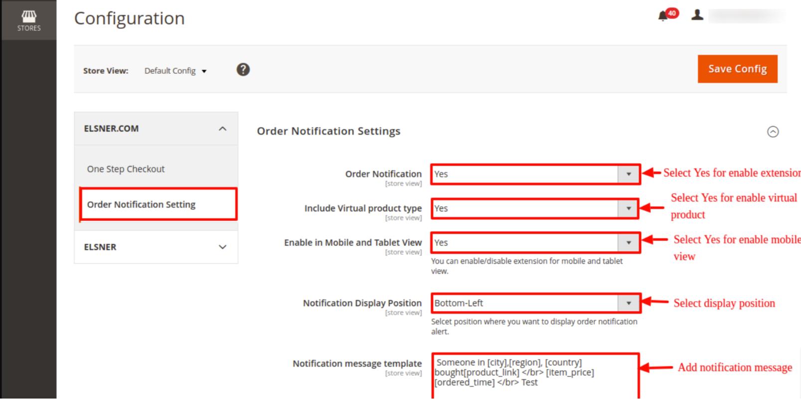 - Order Notification: Set Yes/No to enable or disable the nortification in front-end.