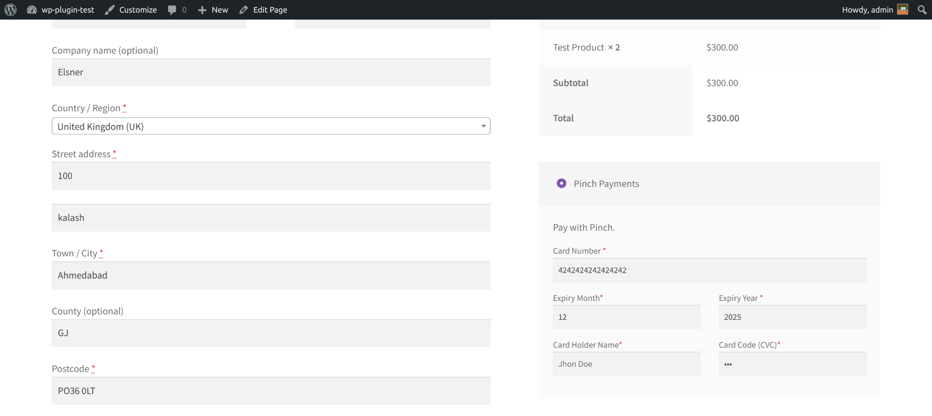 1) After adding product in cart navigate to checkout page and select Pinch payment for payments option and fill details.