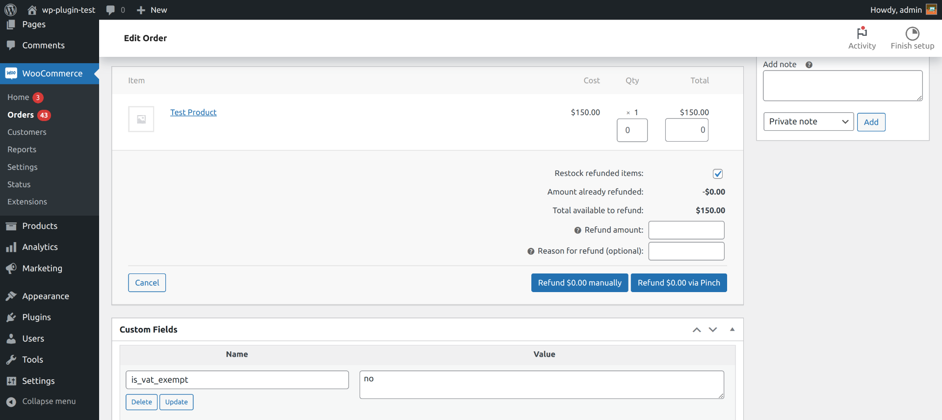 1) Navigate to order page and fill refund amount and reason and hit Refund with pinch.
