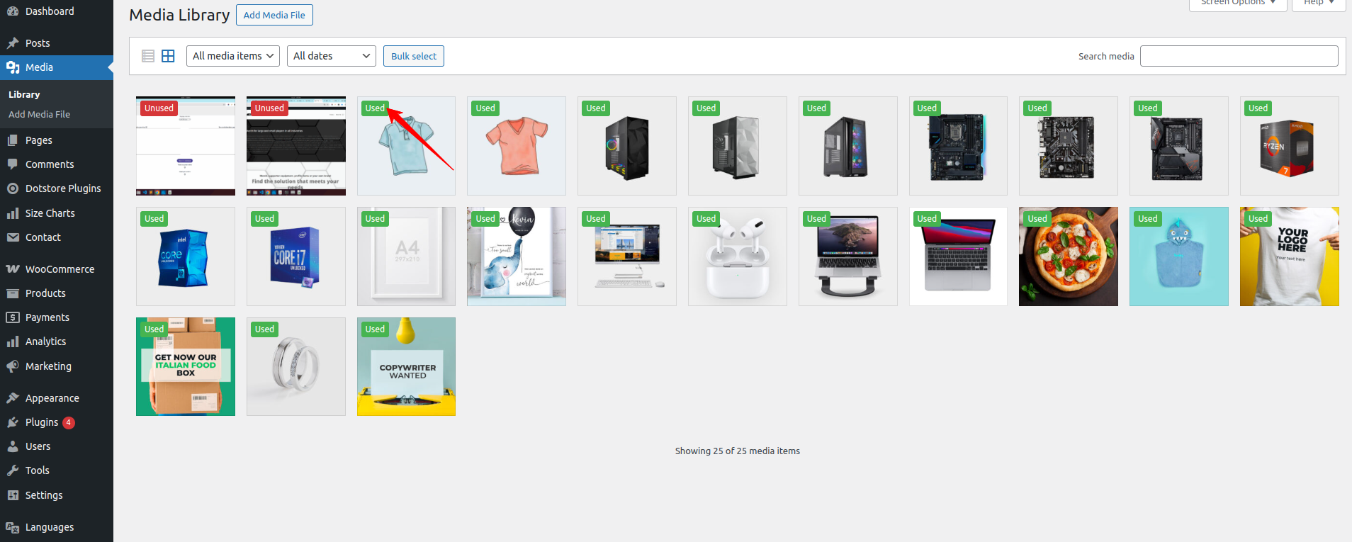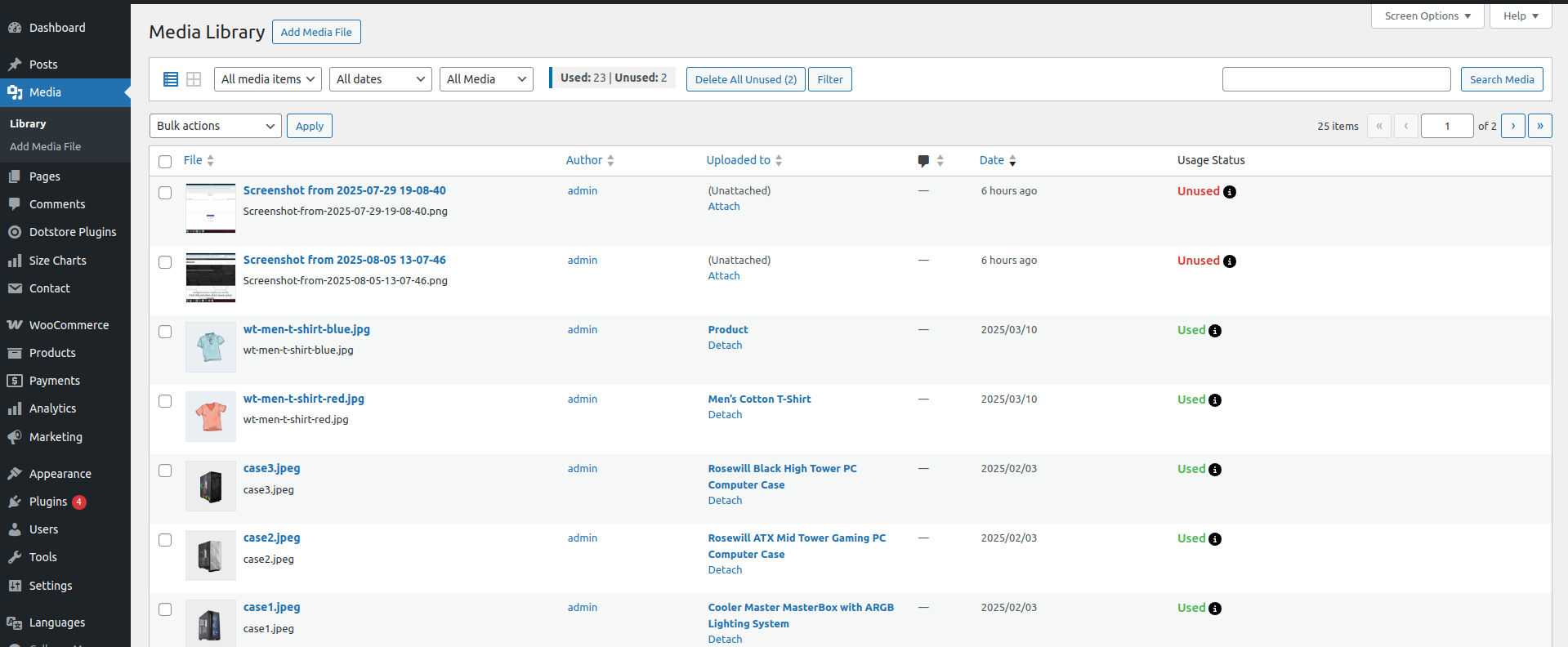- Which images or files are actively referenced in posts, pages, products, or custom post types.
