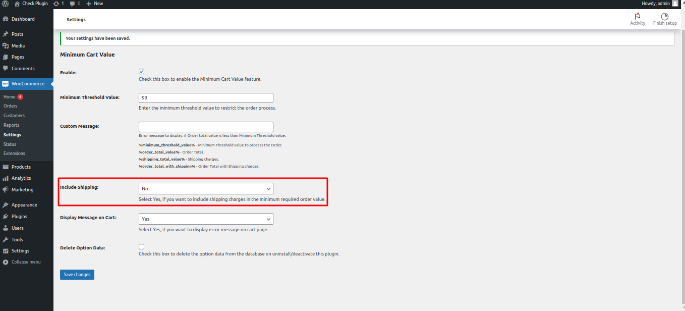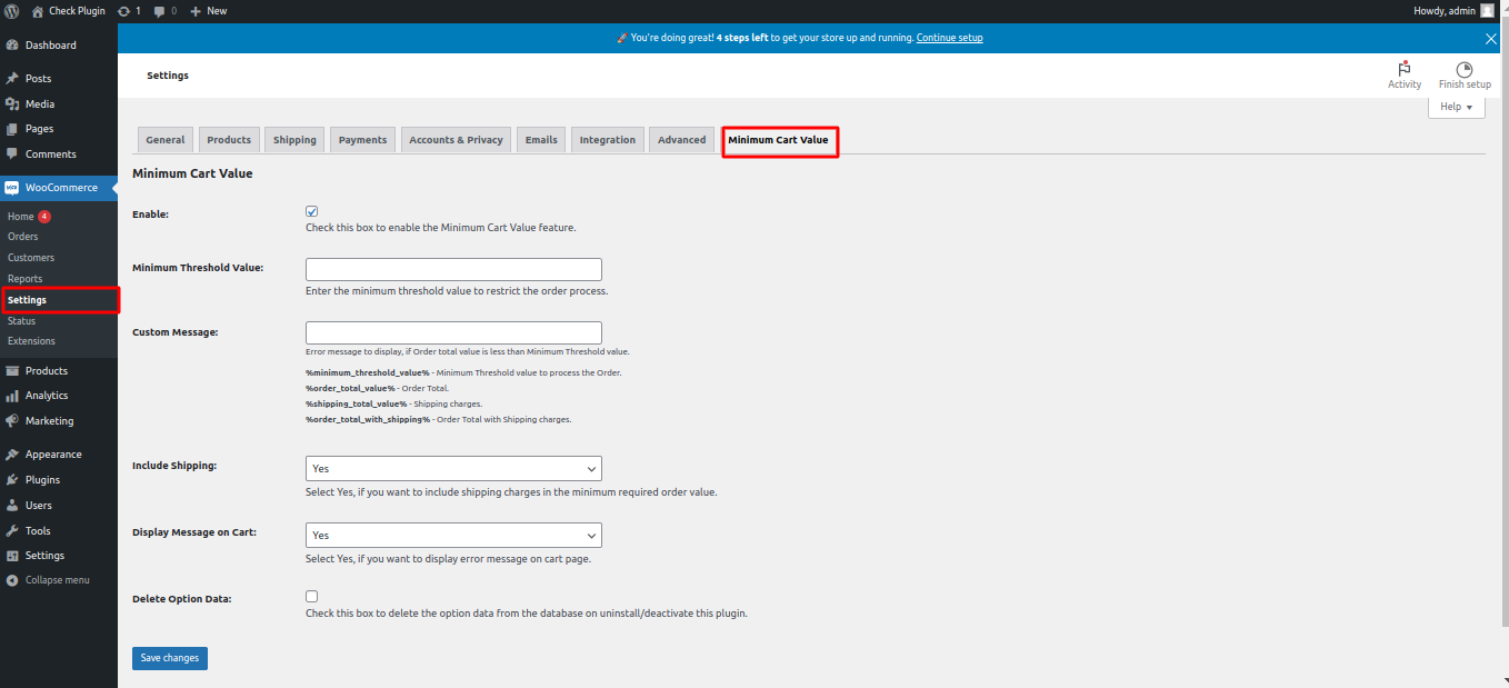 - Navigate to WooCommerce > Settings > Minimum Cart Value.