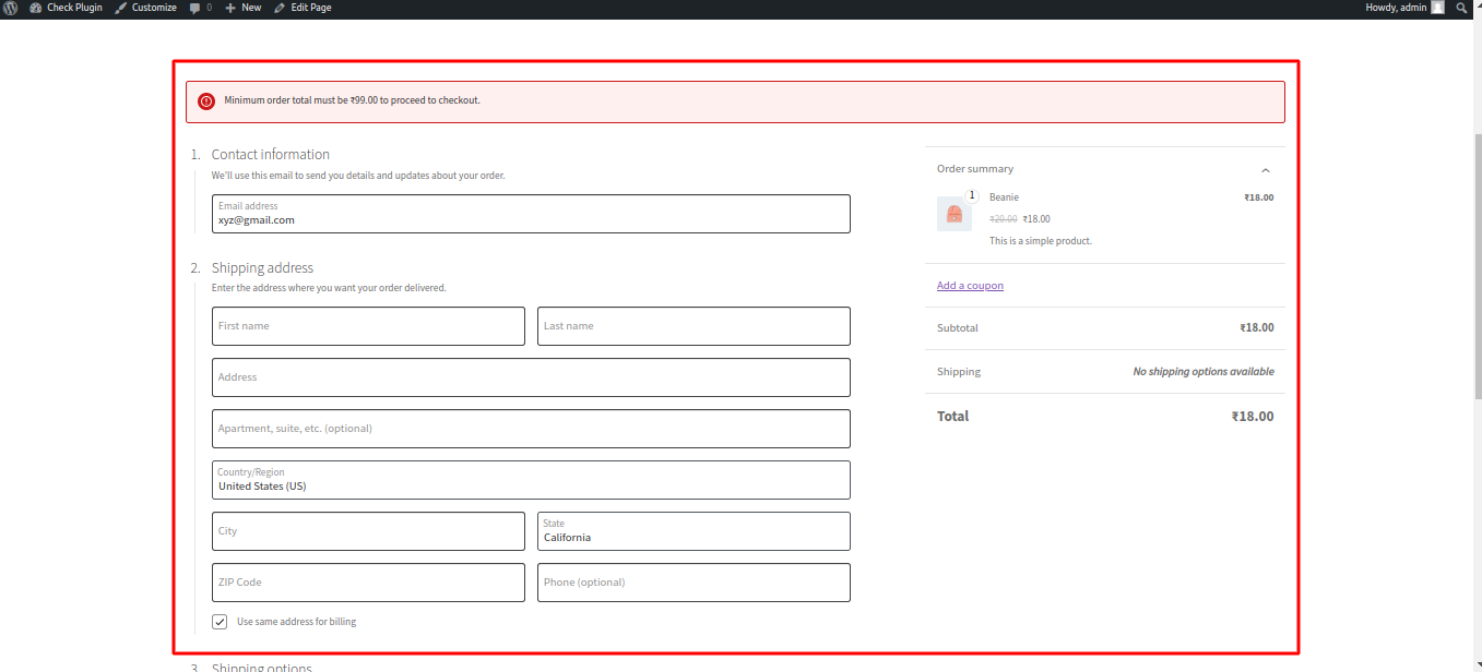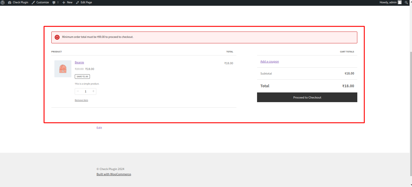 Once configured, the plugin will automatically check the cart total against the minimum requirement during checkout. If the minimum isn't met, the customer will see the configured error message on the cart page and be unable to proceed to checkout until their cart total reaches the minimum threshold.
