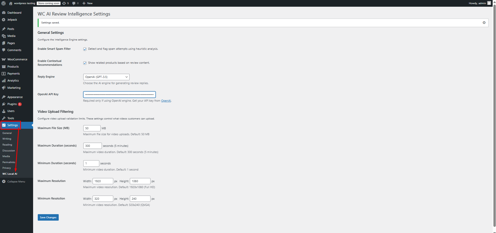 3. Navigate to WC Local AI under the Settings section in the dashboard to configure the basic options (the plugin works out of the box with default settings).