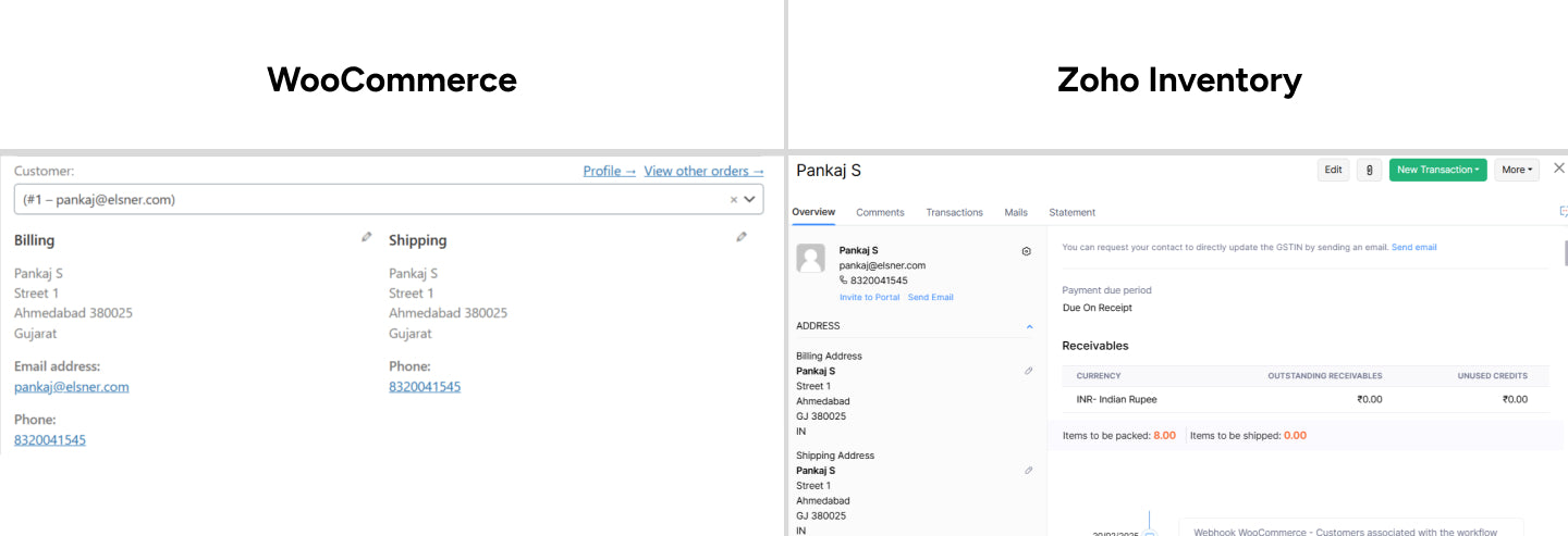 → Customer data mapping with email, phone, and address fields – All customer information syncs between systems without gaps after WooCommerce integration with Zoho Inventory.