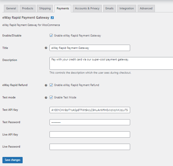 3) Get the Test API Key and Password - Navigate to 'My Account > API Key' on the menu - Add this API Key and Password to WooCommerce > Settings > Payments > eWay Rapid Payment Gateway.