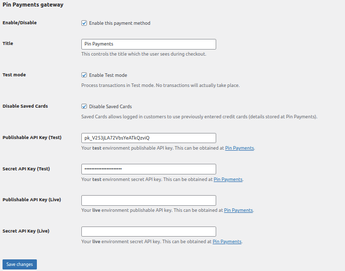 To test the Pinpayment gateway on your site before going live, use these test cards for payment: