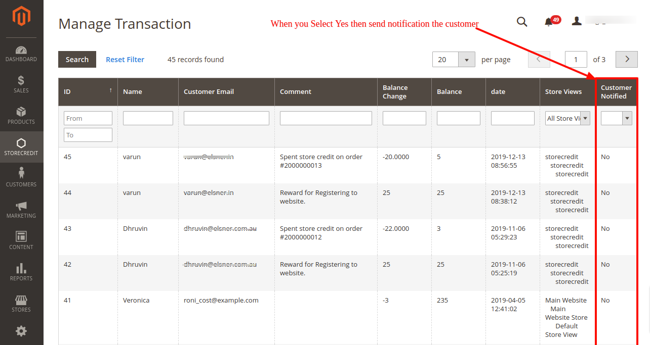 In addition, the extension comes with the transparent transactions grid. The grid provides an overview of the credit transactions each referenced with an order or customer details pages. From the grid, store owner can update customer's credit balance individually.
